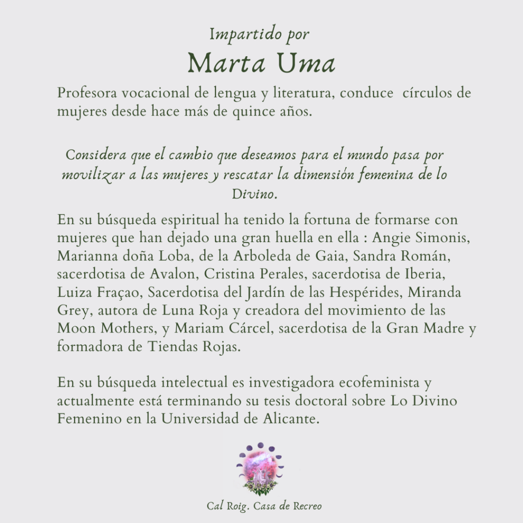 Marta Uma nos facilitará desde el puro rito psicomágico a la comprensión intelectual de las tradiciones de culto a lo Sagrado Femenino. Investigadora incansable, compartirá una tarde donde bucear en historia, mitología, simbolismo, psicología y espiritualidad femenina. Entender estos Tiempos desde este espacio de Mujer.
